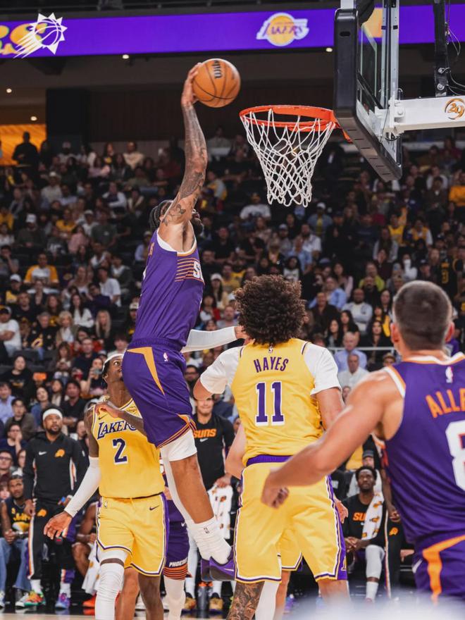 东契奇和詹姆斯都不打,考验里夫斯的带队能力了。湖人中锋海斯透露,今年休赛期增重9公斤,自己不再担心对抗问题。说回比赛,湖人开场紧咬比分,接下来长达7分钟没有运动战进球。太阳打出11比0的攻击波,最多领先到18分。